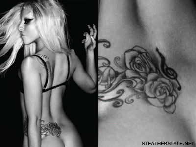 她的第一个纹身是在她背部下面的一个高音音符。很显然,音乐一直是她生活中的重要组成部分。这个纹身是在她十七岁的时候,后来她她旁边又放了一个大花纹身,但并没有把这个音符盖住。